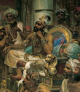 | The Zamorin of Kozhikode (Calicut) (1495–1500) on his throne as painted by Veloso Salgado in 1898 (Source: Wikipedia) |